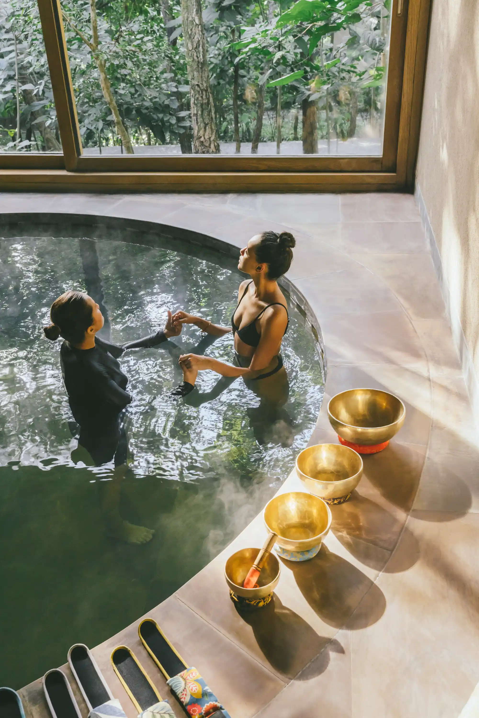 Tout au long de la journée, vous pourrez profiter librement des espaces thermaux - sauna, bassin Watsu, piscine intérieure, bains froids - en alternant chaleur et temps de repos.