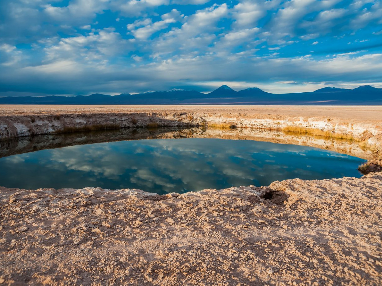 Le voyage commence au majestueux Salar de Atacama, le plus grand désert de sel du Chili, où l’horizon devient blanc et où les flamants roses se reflètent dans les eaux teintées de rose de la lagune Chaxa.