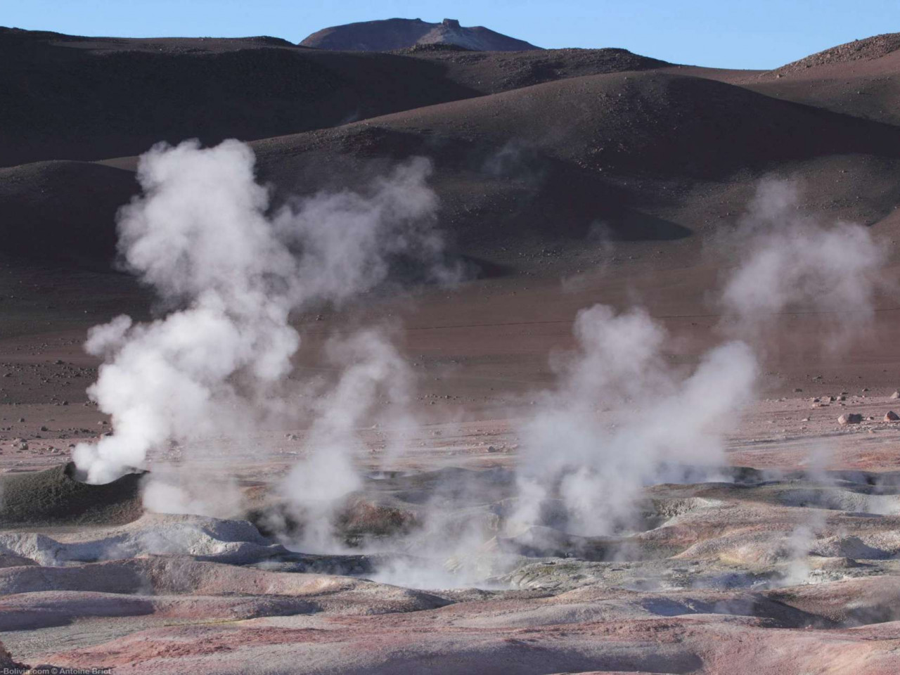 À plus de 4 200 mètres d’altitude, le lever du soleil offre un spectacle inoubliable : des colonnes de vapeur s’élèvent à la lumière du soleil qui se lève entre les volcans.