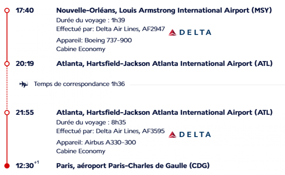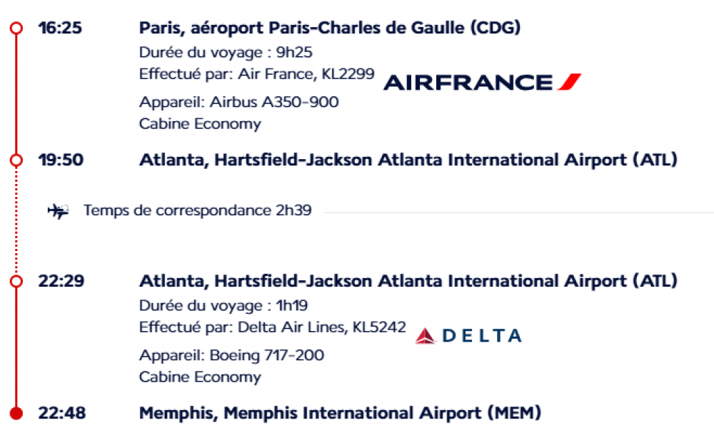 - Les vols internationaux PARIS / MEMPHIS et NOUVELLE ORLEANS / PARIS (sur vols réguliers DELTA AIRLINES ou similaire).