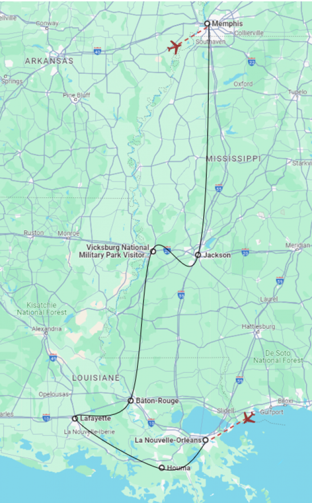JOUR 5 : JACKSON / VICKSBURG / BATON ROUGE (LOUISIANE) (310 km - 3h30) - 09/10/2026