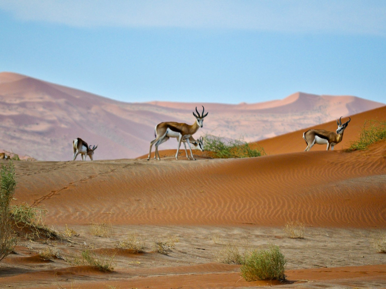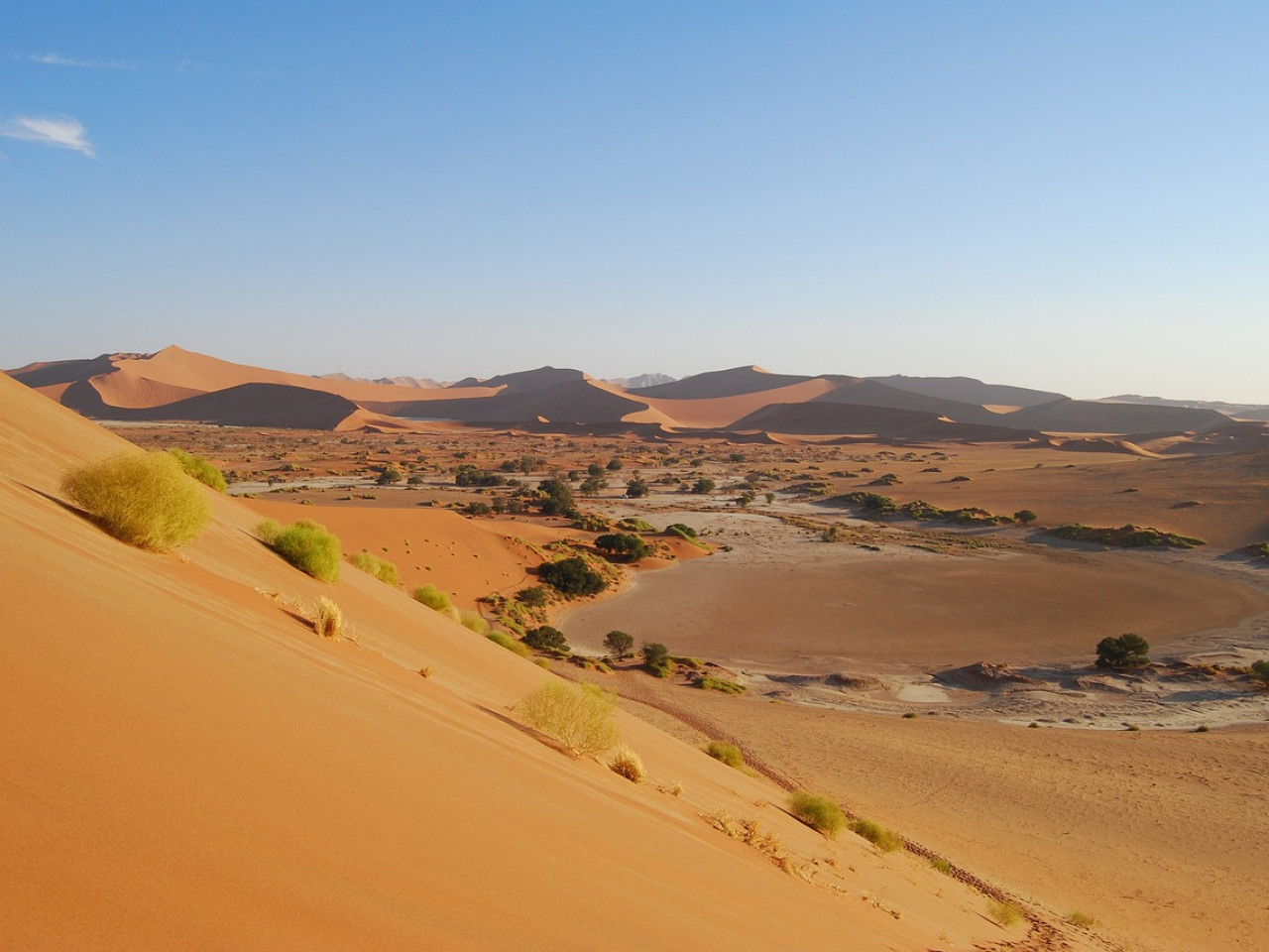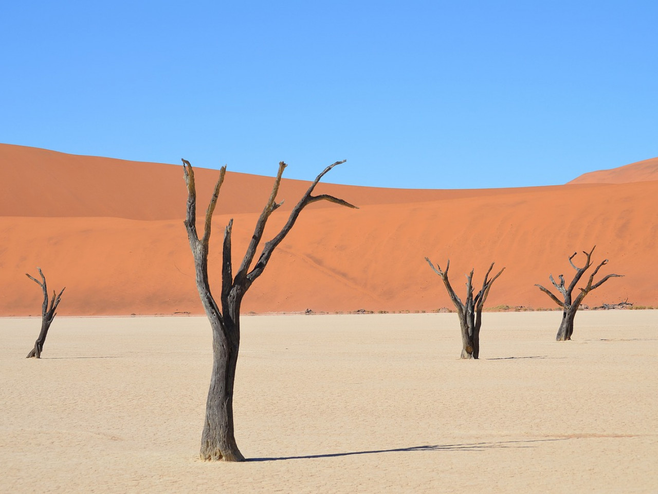 Ce site exceptionnel se révèle comme un décor irréel, figé depuis des siècles : une cuvette d’argile blanche éclatante, parsemée d’arbres morts aux troncs sombres, pétrifiés par le temps et la sécheresse. En toile de fond, les immenses dunes rougeoyantes, dont certaines culminent à plus de 300 mètres, se dressent comme des remparts de sable.