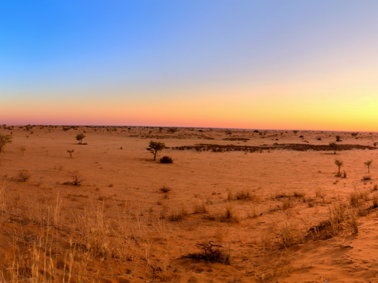 Terre ancestrale des Bushmen, le Kalahari, désert de 500 000 km², recouvre également une partie des terres du Botswana et de l’Afrique du sud. Ce désert se caractérise par une alternance de pans asséchés et de dunes rouges longitudinales dressées en ligne espacées de vallées auxquelles la végétation apporte un contraste de couleurs.