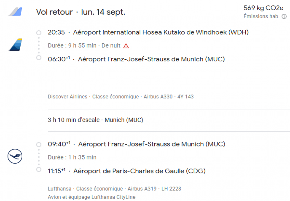 - Les vols internationaux PARIS/ WINDHOEK/ PARIS (sur vols réguliers LUFTHANSA ou similaire).