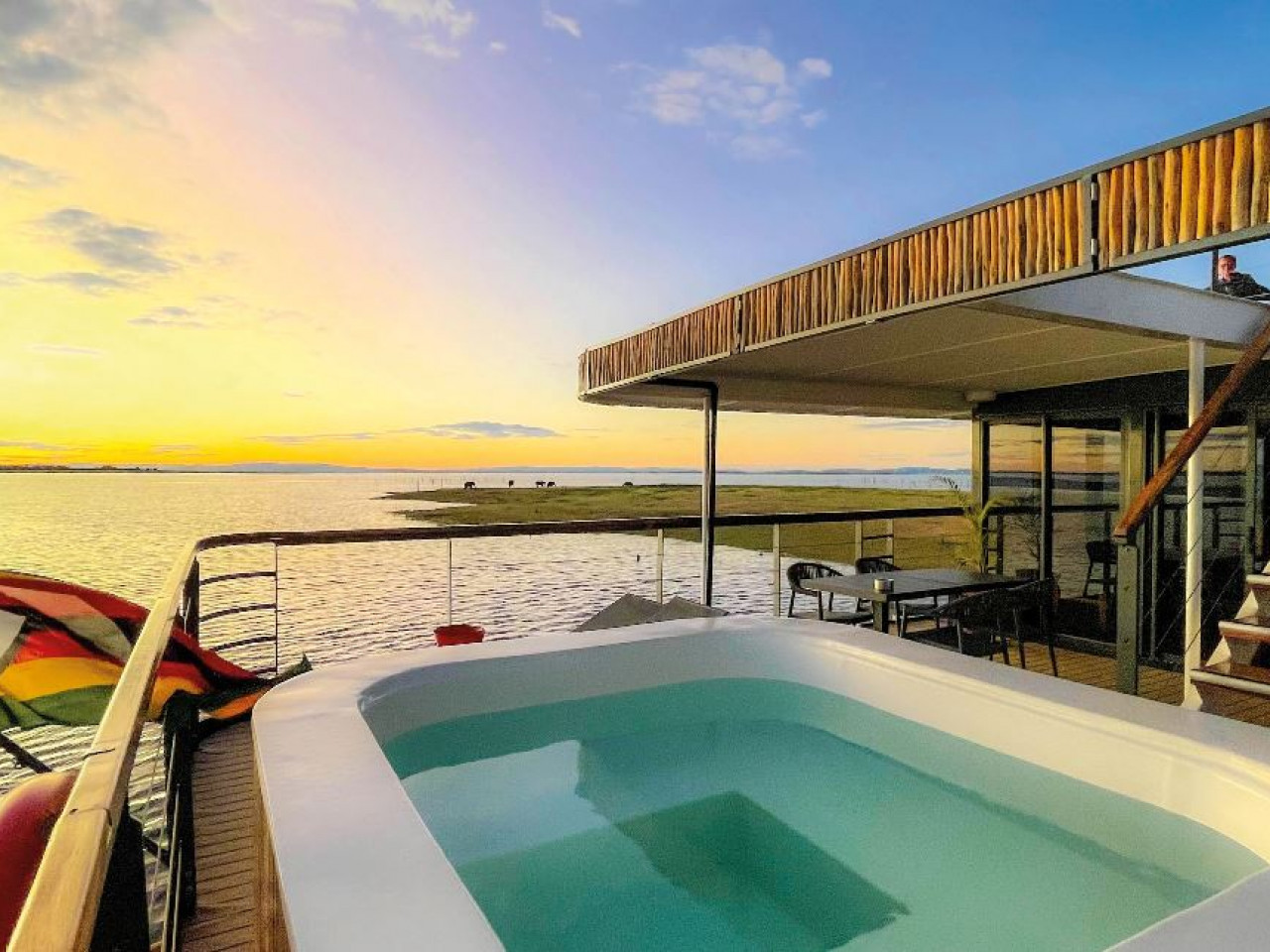 Combining elegance and exoticism, comfort and refinement, the RV Zimbabwean Dream is a superb 5-anchor boat, measuring only 33 m long and 8 m wide, which sails on Lake Kariba. It can accommodate 16 passengers, in 8 cabins with an area of 17 m2. They have a French balcony (two of them have a private balcony), all the amenities and offer the best living conditions. Its vast volumes and ample windows give it a luminous appearance; the noble wood of its materials, its fabrics decorated with local representations blend it into perfect harmony with the splendid landscapes it crosses. On the upper deck there is a small swimming pool, as well as the restaurant and lounge/bar, where a long view allows you to be up close to the surrounding fauna and flora. Finally, the sun deck remains the ideal place to relax and admire the grandiose sites of southern Africa, among the most beautiful in the world.