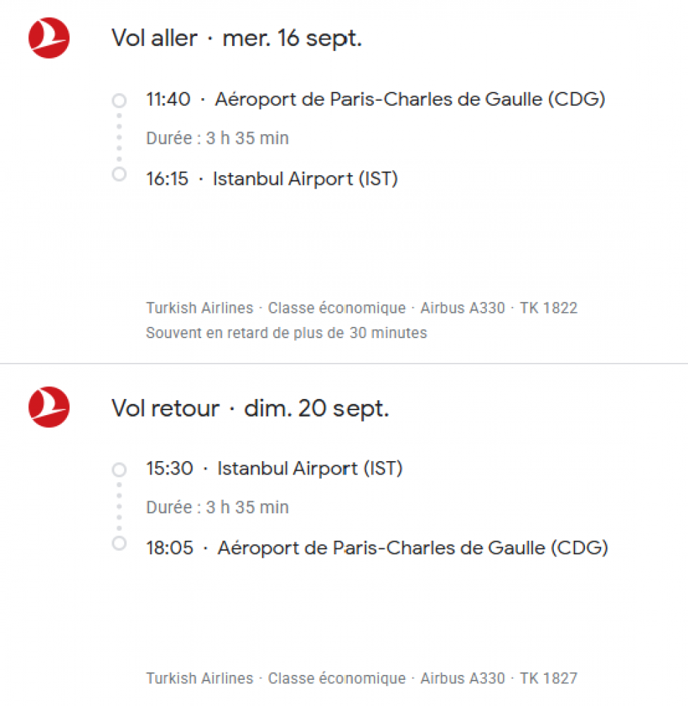- Les vols internationaux PARIS / ISTANBUL / PARIS (sur vols réguliers TURKISH AIRLINES ou similaire).