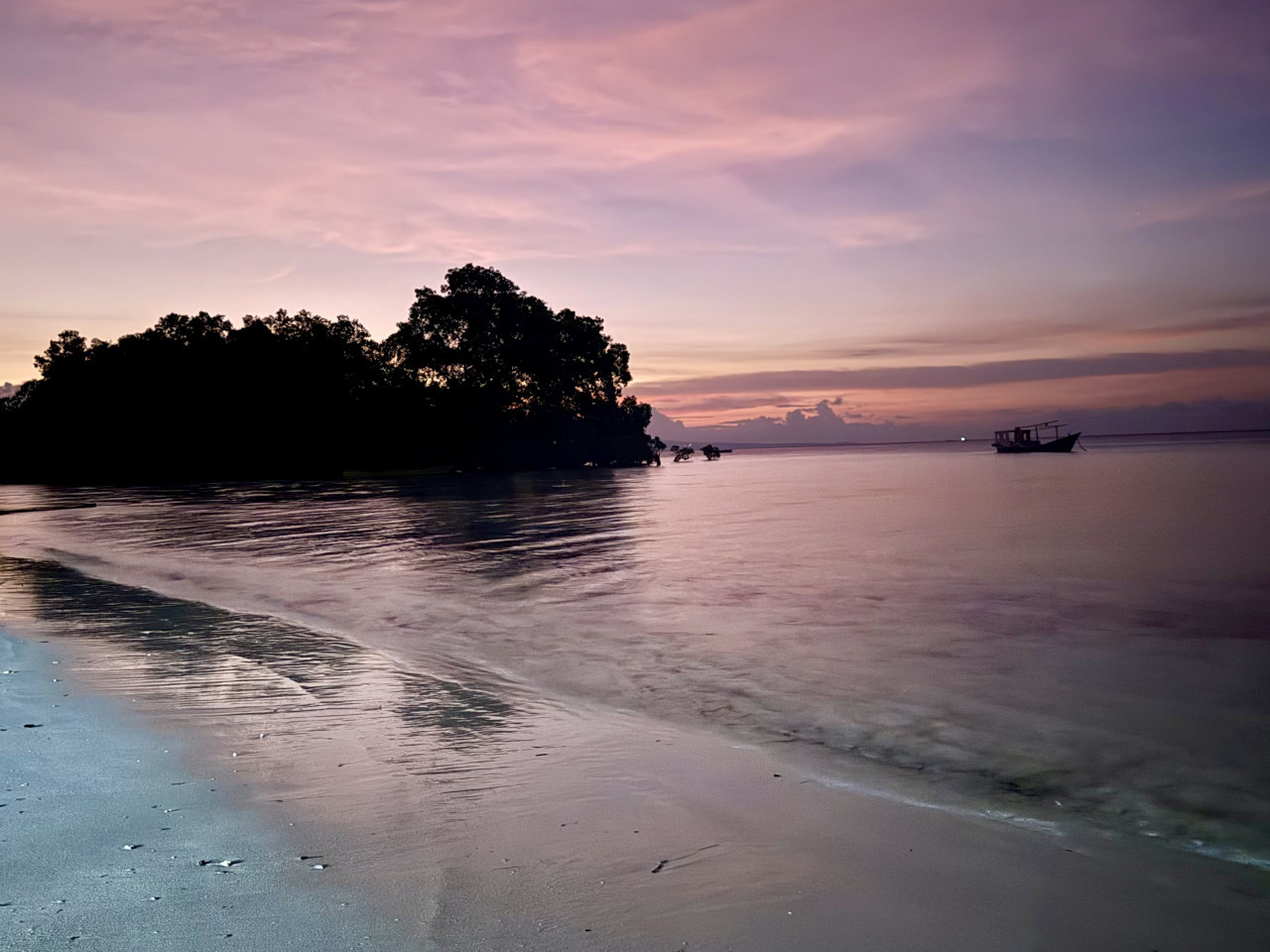 La plage se transforme en miroir géant, où se reflètent les silhouettes tortueuses des palétuviers centenaires.
