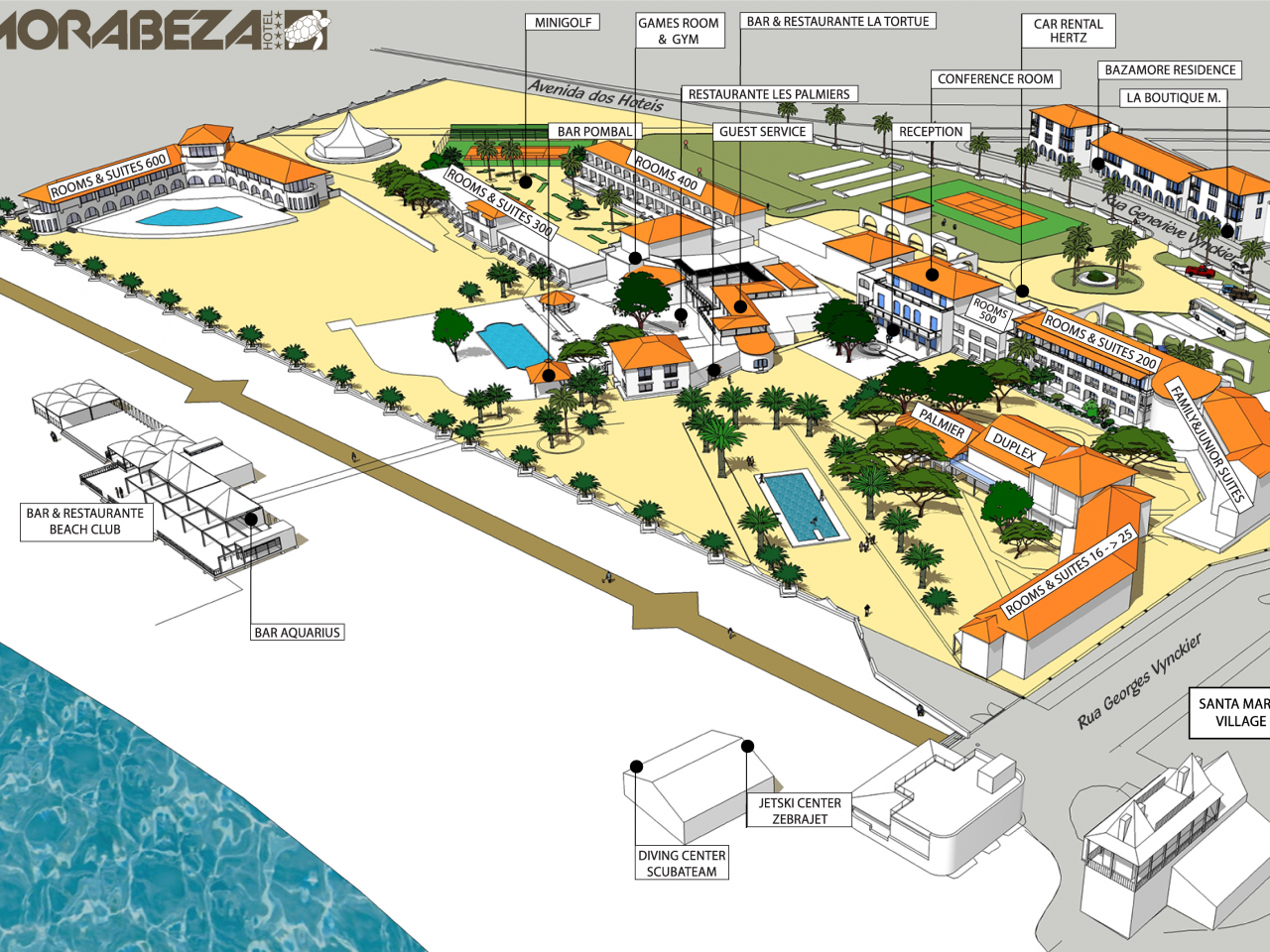 Largely renovated. 121 rooms (including 33 suites and duplexes) in one-story residences, 18 Executive accommodations (reserved for over 12s) in a building with swimming pool, and 8 apartments in the Bazamore residences (on the other side of the road) .