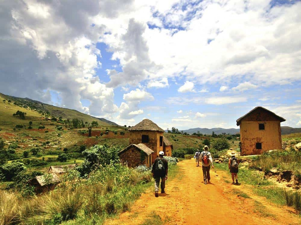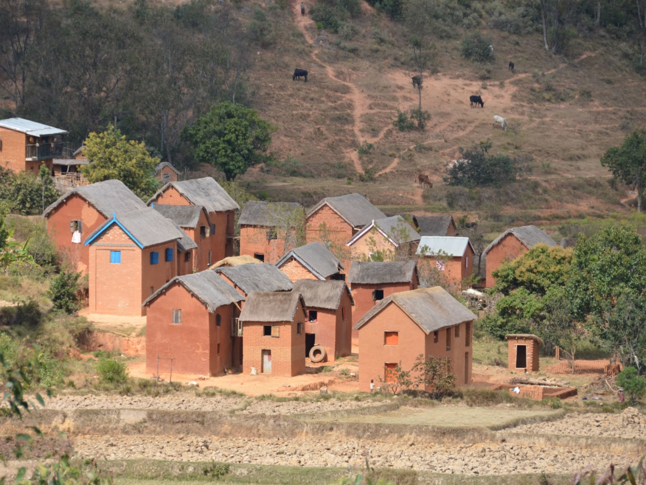 Le long de la route, le paysage des Hautes Terres centrales dominent : maisons à étage en terre rouge, chaîne de montagnes.