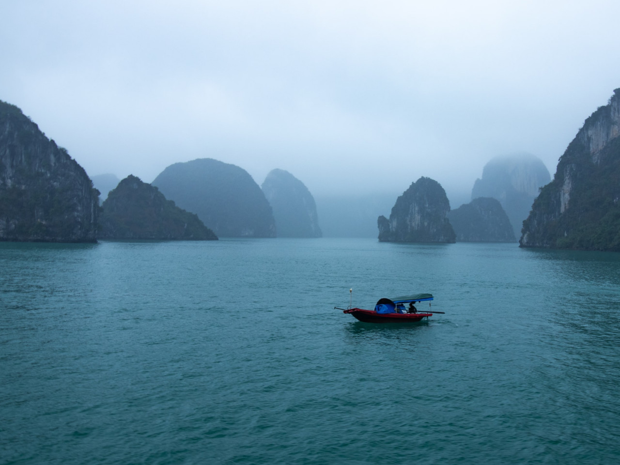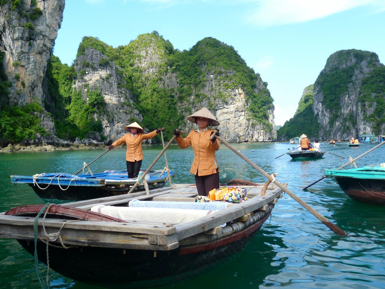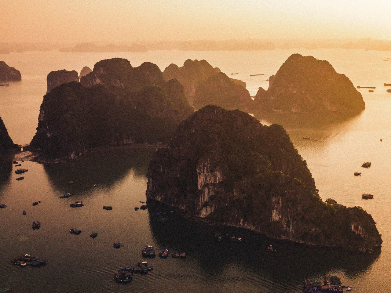 Connue dans le monde entier, la baie d'Halong, constitue l'un des plus beaux paysages du Vietnam, avec ses gigantesques rochers karstiques (rochers-îlots) recouverts de végétation qui semblent surgir de l'eau. on dénombre environ 1 900 îles et îlots karstiques, en général inhabités.